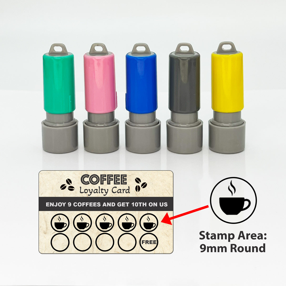 Keep loyal customers coming back with loyalty card stamps. The imprint area is around 9mm in diameter and it can be easily refilled with flash ink with no separate ink pad required. The stamp case for these stamps is available in 5 different colours so you can match them to your reward card.